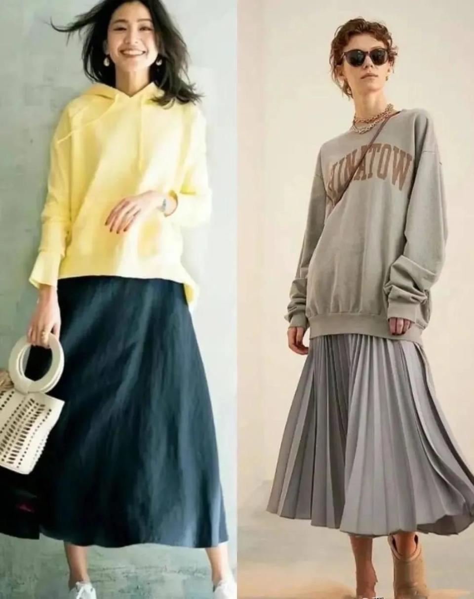 还可以选择百褶半身裙来搭配百褶半身裙,穿在身上比较有垂坠感,而且非常适合成熟女性借景穿搭,例如下面这一件卫衣搭配上灰色的百褶半身裙,脚踩一双短靴或者是浅口单鞋,轻轻松松就能穿出成熟优雅得体的造型来。