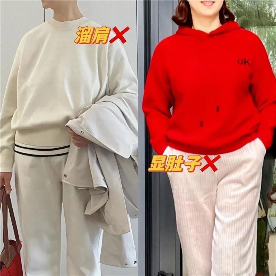虽然推荐大家穿松不穿紧,但是有的时候也不能过于宽松,例如下面这两件卫衣,一件穿在身上之后就比较溜肩,另一件腰间的位置设计过于宽松会显肚子。