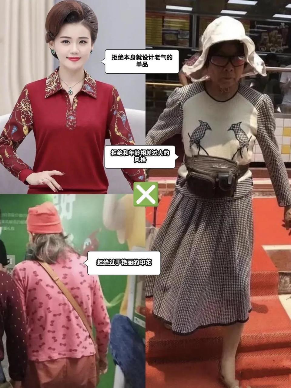 大家看下面这三张图的穿衣打扮就可以得出一个非常明确的答案,如果你选择的衣服是印花,或者是衣服的颜色过于暗沉,过于艳丽穿在身上之后就会显得特别的老气,加上本身已经是中年女性了,穿这样的衣服风格也不适合自己。