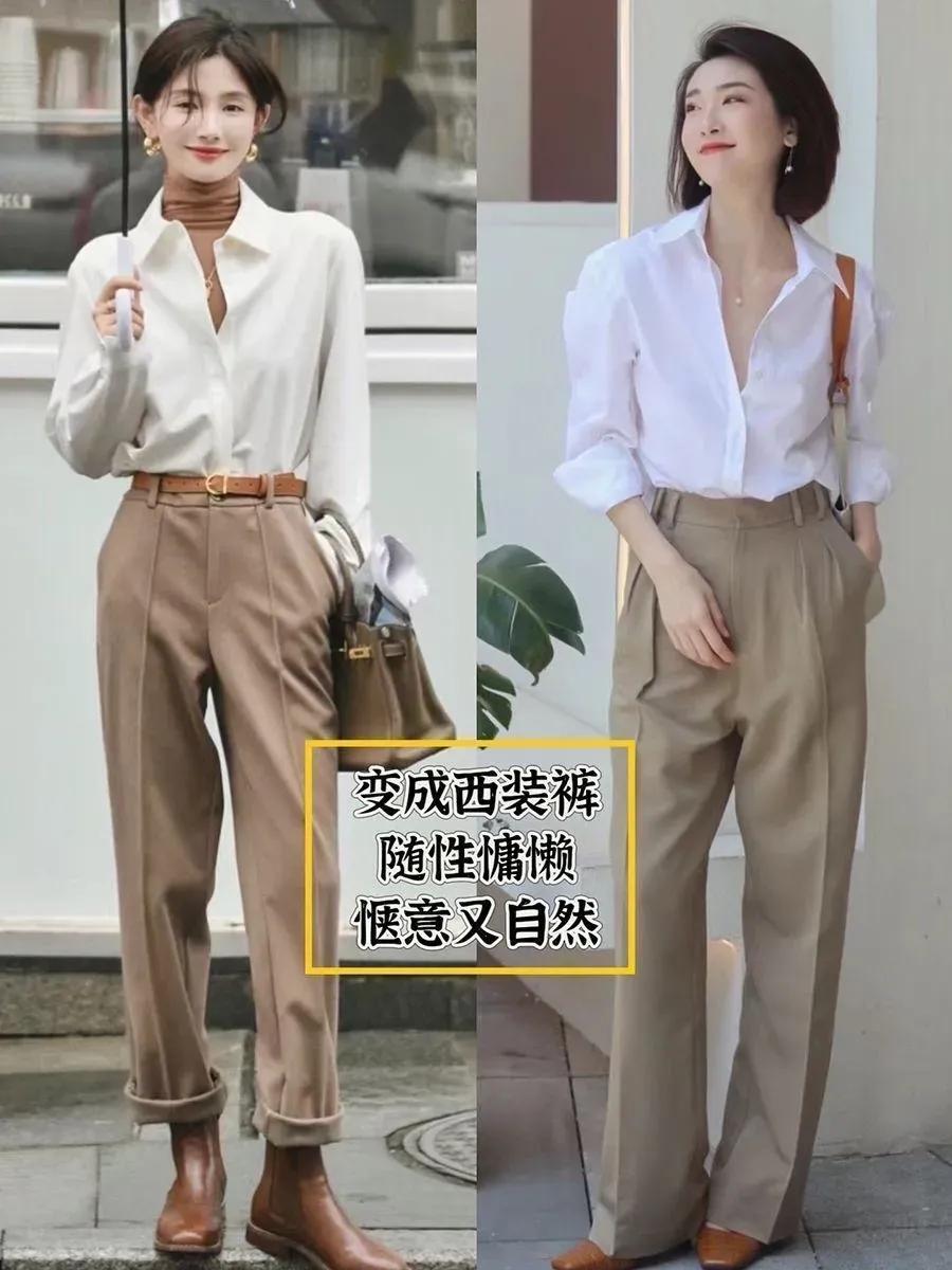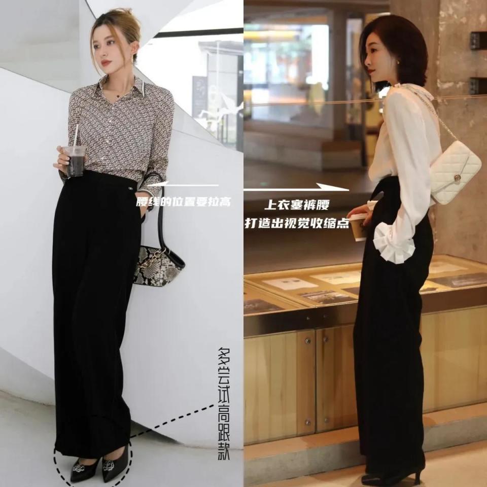 正常情况下来说,我们选择的裤子也尽量选择阔腿裤,直筒裤,九分裤,裤子不能太长太长的情况下会容易压身,例如下面这两套穿衣打扮还是非常不错的,用印花的衬衫或者是白色衬衫搭配上黑色的西装裤,脚踩一双高跟鞋,轻轻松松穿出职场女性该有的造型,简约干练通勤时髦。