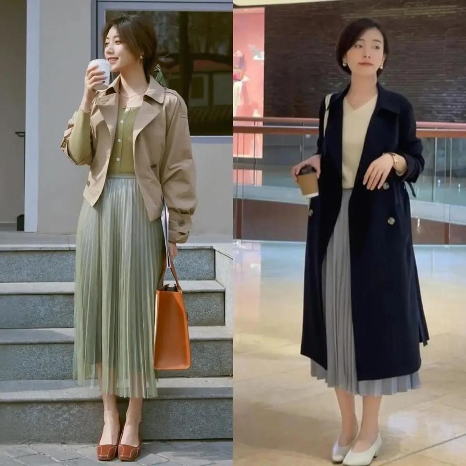 长相成熟,又想要穿出一种稳重的造型和气质感,那么就可以选择一件藏蓝色的风衣外套,内搭一件V领的毛衣,下半身选择灰色的百褶半身裙,脚踩一双浅口的单鞋,把内搭的毛衣一角扎进裙子里面,就能提升腰线了,创意造型适合小个子女生,又很适合奔三奔四的中年女性。