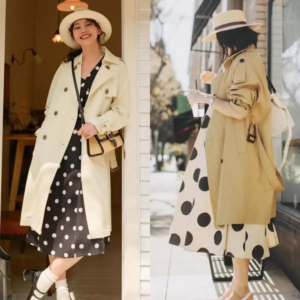 优雅感的情况下,你可以选择风衣外套搭配上连衣裙或者是半身裙旅游,下面这两位达人选择了卡其色的风衣内搭波点的连衣裙,脚踩一双粗跟的浅口单鞋,轻轻松松穿出时尚感。