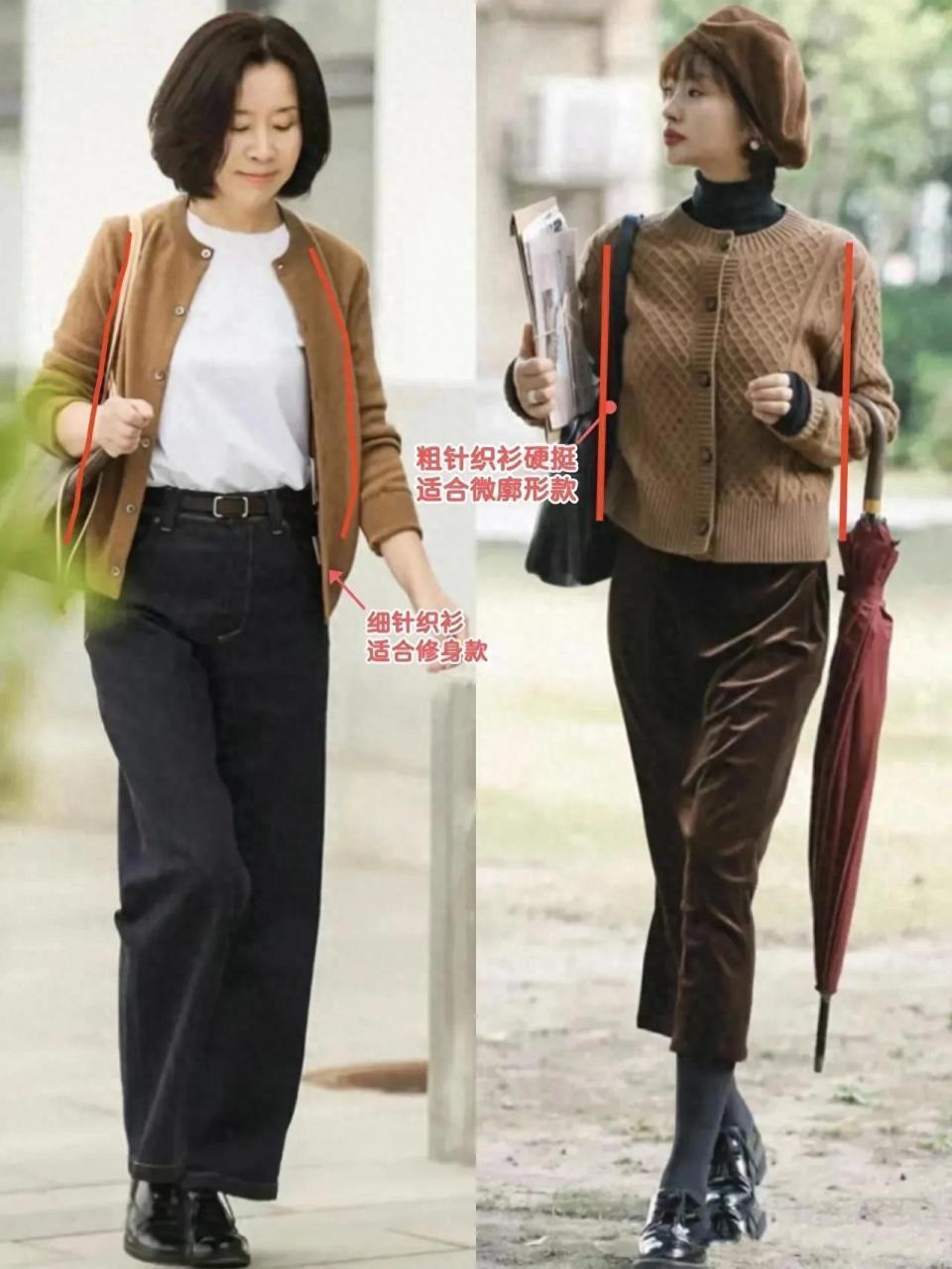 例如下面这两位素人博主的穿搭造型就很不错,选择了针织开衫搭配T恤或者是半高领的毛衣,加上阔腿裤或者是半身裙呈现出来的效果,简约大方或者是优雅得体,展现出不一样的女人味。